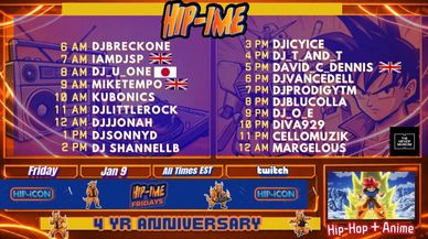 HIP-IME STARTED ON TWITCH WITH A WEEKLY RAID EVENT CALLED HIP-IME FRIDAYS. THE EVENT INCLUDES SOME OF THE BEST DJ’S WORLDWIDE MIXING HIPHOP WITH ANIME VISUAL. HIP-IME LIVE TWITCH PAGE COMING SOON.